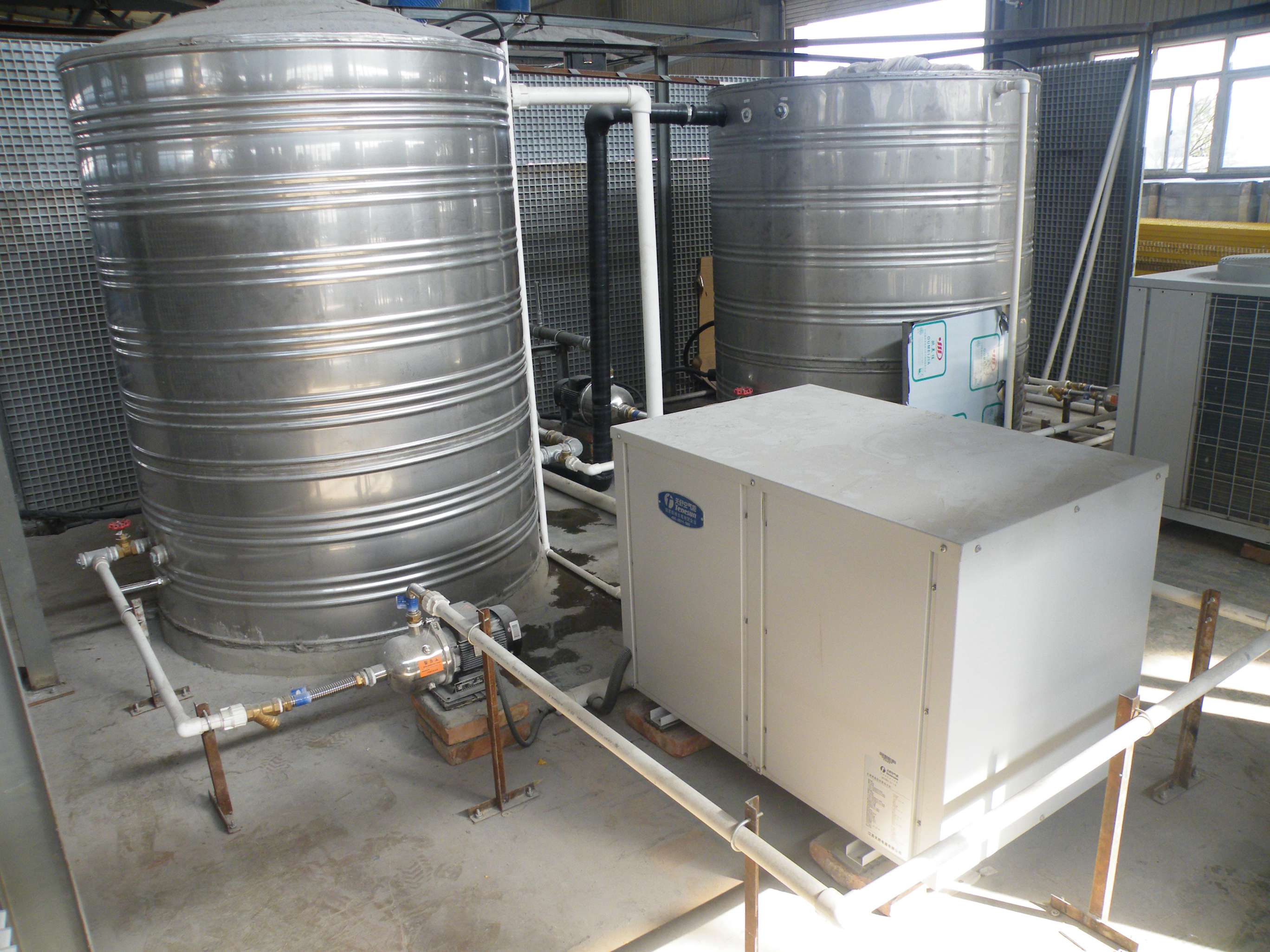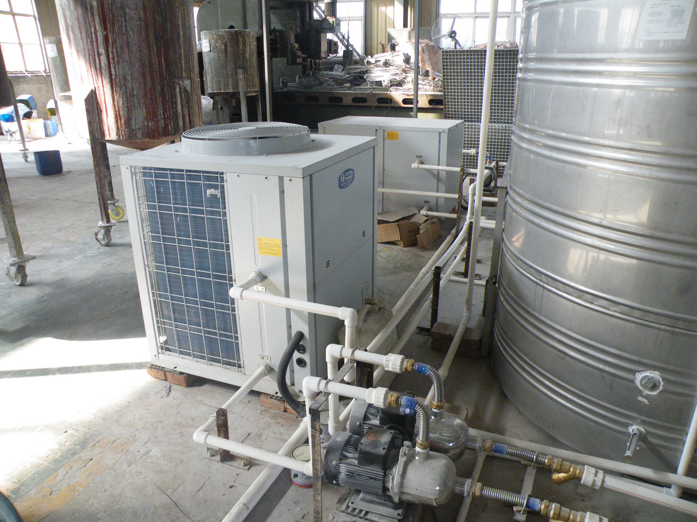 南通環(huán)宇鋼結(jié)構(gòu)工程有限公司一共八條生產(chǎn)流水線,每條生產(chǎn)流水線需要70度左右的高溫將塑料粒子融化,接著冷卻成型,使用高溫空氣源熱泵熱水機(jī)不斷給生產(chǎn)線進(jìn)行升溫,將塑料粒子融化,然后進(jìn)行余熱回收,再將生產(chǎn)線的水溫降低,使塑料粒子成型,將回收回來的熱量同時協(xié)助空氣源熱泵做高溫?zé)崴?/p>