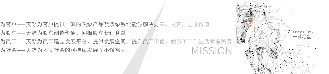 天舒不忘初心,牢記使命,致力于環(huán)保節(jié)能事業(yè)發(fā)展。一直以來,天舒引領國內(nèi)熱泵行業(yè)發(fā)展,開啟環(huán)保事業(yè)新篇章。早在各地政府的煤改電扶持政策下發(fā)前,天舒已在全國范圍內(nèi)大力實施農(nóng)村煤改電項目。天舒積極響應國家全民健身計劃,打造綠色健身泳池系統(tǒng)方案。天舒不斷探索熱泵應用新領域,例如烘干、冷熱回收等,開發(fā)的一系列新產(chǎn)品在農(nóng)業(yè)、種植業(yè)、畜牧業(yè)等傳統(tǒng)行業(yè)得到廣泛使用,掀起環(huán)保節(jié)能新浪潮,帶動能源改革,引領行業(yè)從千億級市場向萬億級市場跨越。創(chuàng)立至今,天舒的腳步不曾停歇,每一步都在為更綠色的世界積蓄能量。