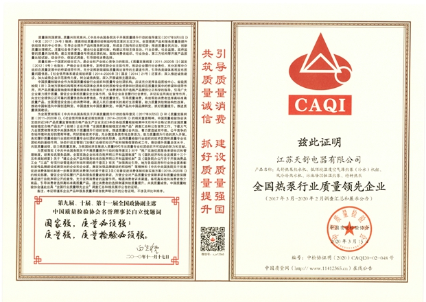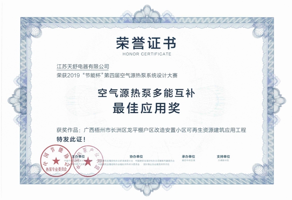 天舒作為家用及商用熱泵國家標準主筆起草企業(yè)、《熱水器選用與安裝》國家建筑標準設計熱泵圖集主要編寫單位,已全面通過ISO9001、ISO14001、ISO45001、3C認證、機電設備安裝工程三級資質(zhì)、CRAA產(chǎn)品等多項認證。